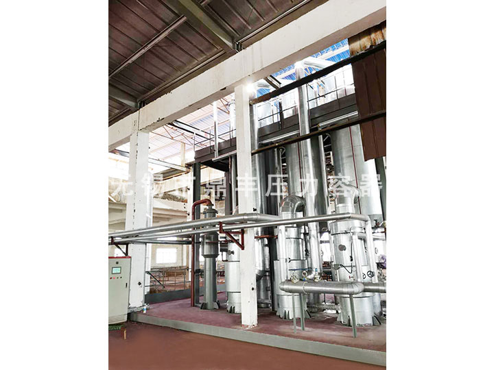 工作時(shí),原料液由進(jìn)料泵進(jìn)入,經(jīng)流量計(jì)、調(diào)節(jié)閥進(jìn)入利用三效蒸發(fā)分離出來(lái)的二次蒸汽作為熱源的預(yù)熱器進(jìn)行預(yù)熱。約預(yù)熱至50℃左右,之后進(jìn)入二效蒸發(fā)器,物料在二效蒸發(fā)器內(nèi)與二效加熱器循環(huán)加熱過(guò)程中不斷蒸發(fā),達(dá)到一定濃度,利用二效與三效間的壓力差,物料以額定流量進(jìn)入三效蒸發(fā)結(jié)晶器,物料在三效蒸發(fā)結(jié)晶器內(nèi)與二效加熱蒸發(fā)器相同方式進(jìn)行不斷加熱蒸發(fā),達(dá)到一定濃度,物料進(jìn)入三效出料逆流泵,逆流泵出來(lái)的物料調(diào)節(jié)額定流量進(jìn)入一效加熱蒸發(fā)結(jié)晶器,在強(qiáng)制循環(huán)蒸發(fā)結(jié)晶室內(nèi)經(jīng)強(qiáng)制循環(huán)泵輸送至加熱器,加熱后的料液循環(huán)進(jìn)入蒸發(fā)分離室,物料在真空作用下,快速被蒸發(fā),濃縮后的料液下行,在導(dǎo)流筒作用下減速自然沉降下行,在此過(guò)程中,過(guò)飽和溶液析出晶體,同時(shí)也在導(dǎo)流筒作用和錐底作用下,晶體往下沉淀至錐底部,經(jīng)泡析腿由晶漿泵抽出,分離室邊上清母液經(jīng)循環(huán)管與強(qiáng)制循環(huán)泵循環(huán)至加熱器,然后到蒸發(fā)分離器,如此不斷循環(huán)蒸發(fā),母液不斷被蒸發(fā)析出晶體,待穩(wěn)定后,根據(jù)析出晶體量調(diào)整出料晶漿泵流量,同時(shí)調(diào)整進(jìn)料量,以達(dá)到與出料量和蒸發(fā)量的平衡,這時(shí)即可進(jìn)行連續(xù)進(jìn)出料。